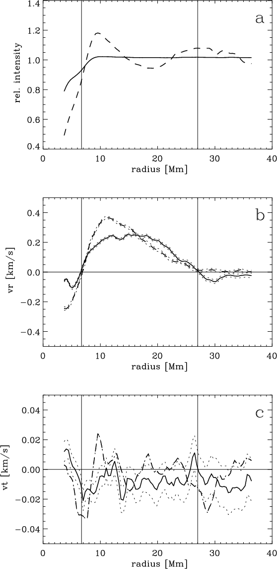 - Outside the moat, the velocity pattern of the supergranulation was observed in WL as ring structures in the radial component and as alternate positive and negative azimuthal values in the tangential component.