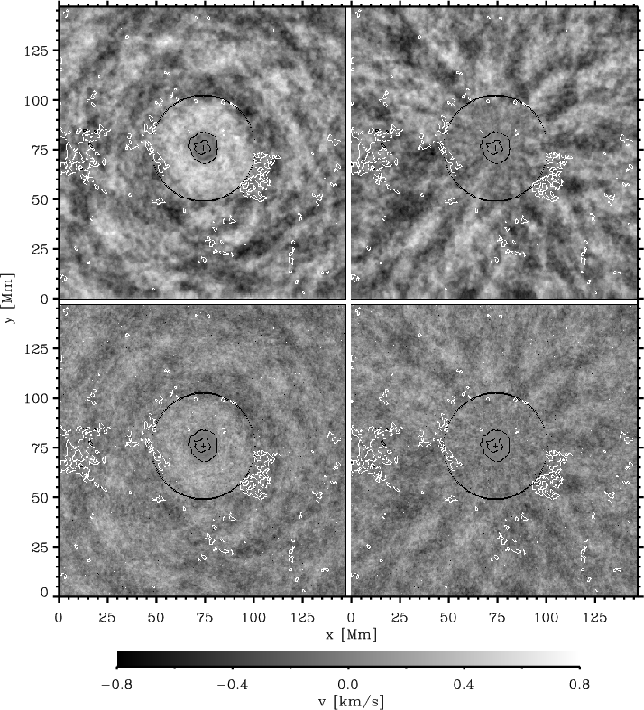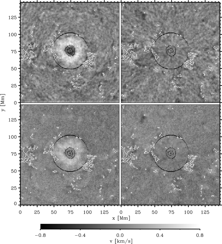 Figure 2: Radial ( left) and tangential ( right) horizontal velocities for the WL series ( top) and the UV series ( bottom), obtained from CLCT with a box size of four pixels. The dark lines mark the outer boundaries of the umbra and penumbra. The extension of the moat is given by the circle with a radius of 27 Mm. The white contours indicate the bright structures seen in the UV. The direction to disk center is downwards. Positive velocities are outward and counterclockwise, respectively. |