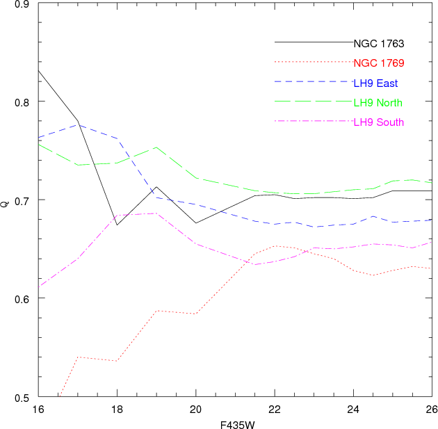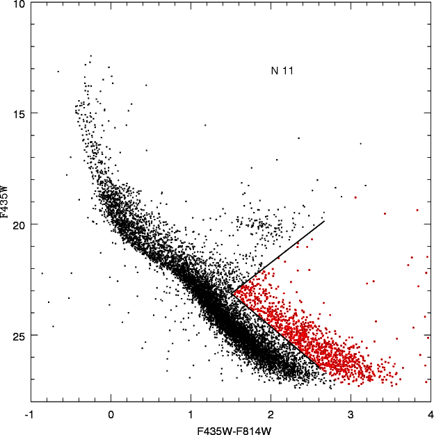 Data for six fields in N11 were taken from the ACS/WFI HST archive (PI Maíz-Apellániz, Proposal ID = 9419). The studied fields are partially covering the associations LH 9, LH 10, and LH 13. In Fig. 1 we sketch the position of the ACS fields in the N11 complex. The control field to sample the background and foreground population is located outside the N11 boundaries and is not plotted. Observations are made in the filters F435W and F814W with long exposures of 496 s and short exposures of 1-2 s. We make use of drizzled files which already account for image distortion. The data are then reduced by means of the packages DAOPHOT/ALLSTAR by Stetson (1994).