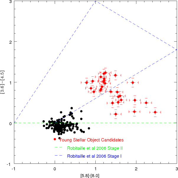 Figure 16: [8.0]-([3.6]-[8.0]) color-magnitude diagram compared with the Whitney et al. (2004) models. The objects redder than the line are likely to be YSOs of the Stage 0-I. |