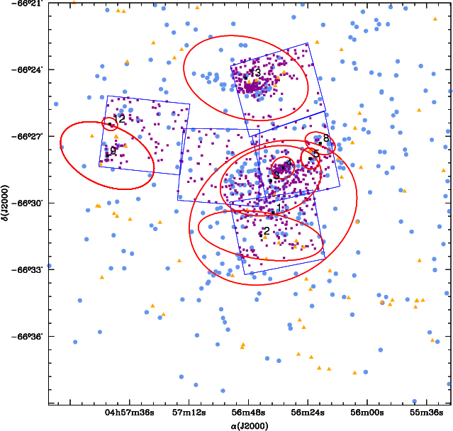 Figure 17: Bica clusters and associations are overplotted on the distribution of PMS (dark magenta dots), the concentration of OB stars (light blue circles) and Herbig Ae/Be stars (orange triangles) (from Hatano et al 2006). Red ellipses represent Bica et al. object dimensions (see Fig. 1 for details). The blue contours show the observed area. |