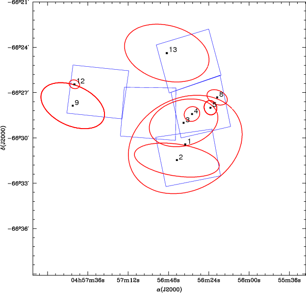 Figure 1: The region containing the studied HST/ACS fields (boxes) is schematically represented. The ellipses indicate objects of particular interest, as clusters and associations. The numbers refer to the object ID listed in Table 1. |