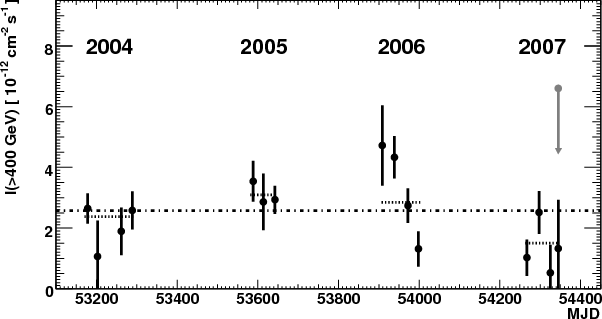 Figure 2: Integral flux, I(>400 GeV), measured by HESS from PKS 2005-489 during each dark period of observations (i.e. moonless night time within a month). Only the statistical errors are shown. The horizontal line represents the average flux for all the HESS observations. The four horizontal line segments represent the average annual flux observed during the corresponding years (see Table 1). |
