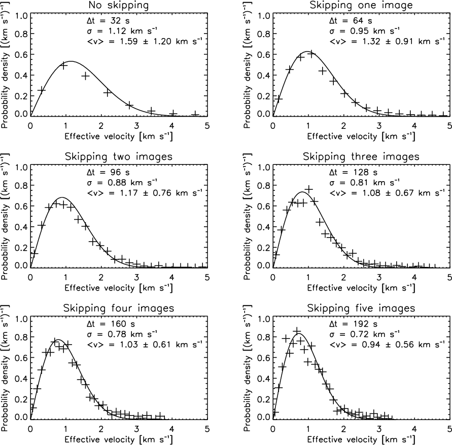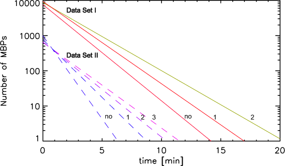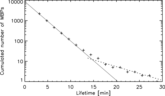 After the application of the segmentation and identification routines (Utz et al. 2009a), we obtain a set of single analysed images. Analysed images means that we have identified the MBP features and obtained relevant parameters like size, brightness and position. For dynamical parameters like lifetimes and velocities, it is necessary to analyse not only a single image but a series of images. The basic idea behind our tracking algorithm is simple. The algorithm takes the position of a detected MBP and compares it to the positions of MBPs in the succeeding image. If two MBPs match within a certain spatial range (which was set to 2.8 Mm for both data sets), the points are identified as the same MBP at different times. Therefore, a subsequent application of this comparison (for all images and all MBPs in the images) leads to complete time-series of MBP features. The algorithm is able to discern between isolated MBPs and groups of MBPs (this is explained in more detail in Sect. 4). The tracking algorithm has to consider several aspects as for instance noise and finite size of the images as well as the time span of the image sequence, to work correctly. All features which are identified either in a single image or in two images should be regarded as noise (or identification artefacts) and are therefore discarded (for possible causes of noise features see Utz et al. 2009a). The spatial limitation of images can cause the time series of a MBP to be interrupted and splitted up. This occurs e.g. when a MBP moves across the border of the image. Thus, all MBPs that move too close to an image border are dismissed. The beginning and end of a time series should be treated the same way. As we do not know whether a MBP existed already before the first exposure was taken, or exists still after the last exposure was taken, all MBPs starting with the first image or ending with the last image are dismissed. All these effects have to be taken into account to avoid an underestimation of the obtained lifetimes. Figure 2 shows an example of MBP tracking.