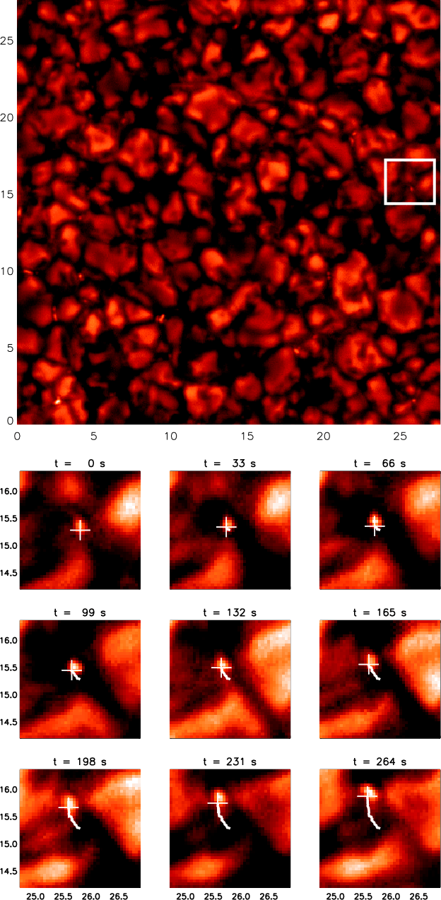 Figure 2: Top panel: starting frame of one of the identified MBPs. Bottom panels: evolution (time series) of the detected MBP in the rectangle. The white cross marks the derived brightness barycenter. The path of the MBP is shown as a white line. Positions are given in arcsec from the bottom left corner of the full frame. |