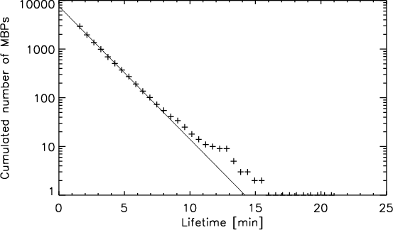 Figure 3: Histogram of the obtained MBP lifetimes of data set I together with an exponential fit (solid line). The histogram was normalised by dividing the counts in each bin by the binsize. The histogram is only shown up to the first zero crossing, i.e. there are a few longer-living MBPs than shown in the figure. |