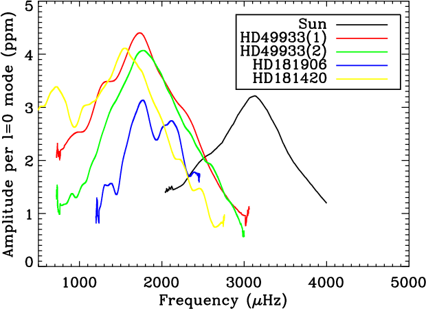 the Sun, HD49933, HD181906, and HD181420.
