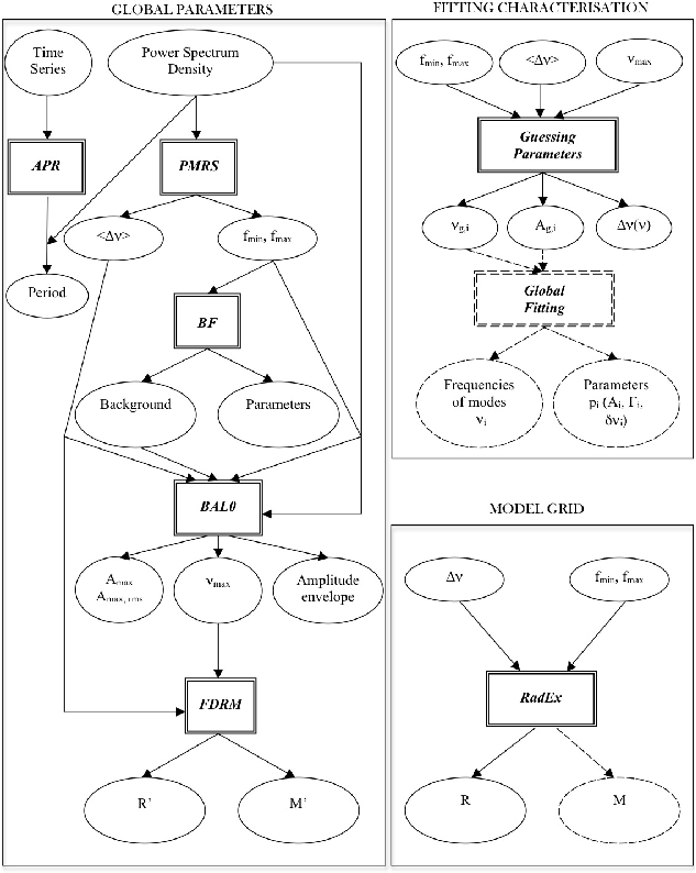 Figure 1: Workflow diagram of the A2Z pipeline to extract the global parameters of stellar oscillations and the characteristics of the modes, and to determine the mass and radius through the comparison with a pre-calculated grid of models. The rectangles represent the code packages and the input/output are in the circles (each output has its corresponding error bar). The dashed lines correspond to the packages that are not described in this paper. |