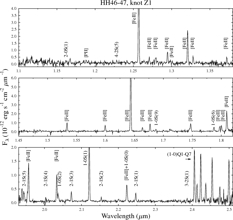 (NIR) line diagnostic on protostellar jets (e.g., Takami et al. 2006; Nisini et al. 2005; Podio et al. 2006; Davis et al. 2006). The main lines used to probe physical and kinematical properties in NIR are [Fe II] (e.g. 1.644