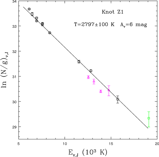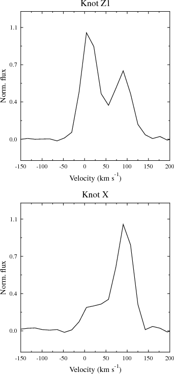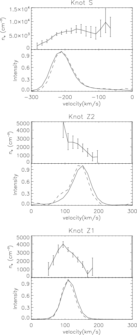 - From the [Fe II]/[P II] ratio, we have estimated the iron depletion in the knots S and Z1. We have found that around 88% and 58% of the iron is depleted in grains in the knot S and Z1.