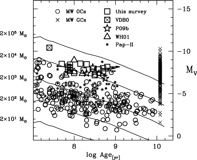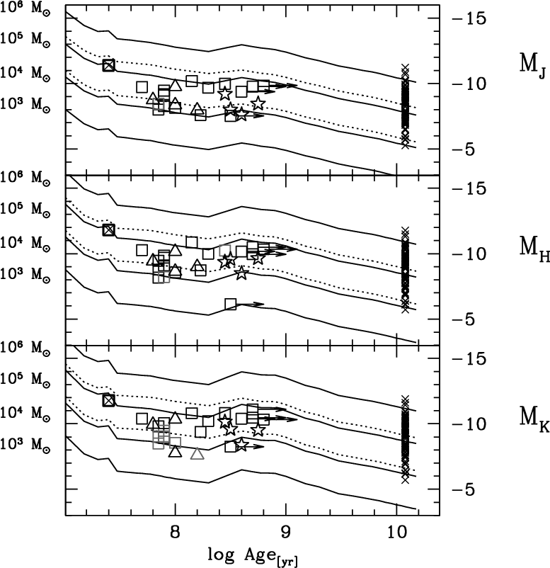 (Age) vs. absolute integrated magnitude plane, using ages estimated from our CMDs and integrated J, H, K magnitudes from 2MASS-6X.