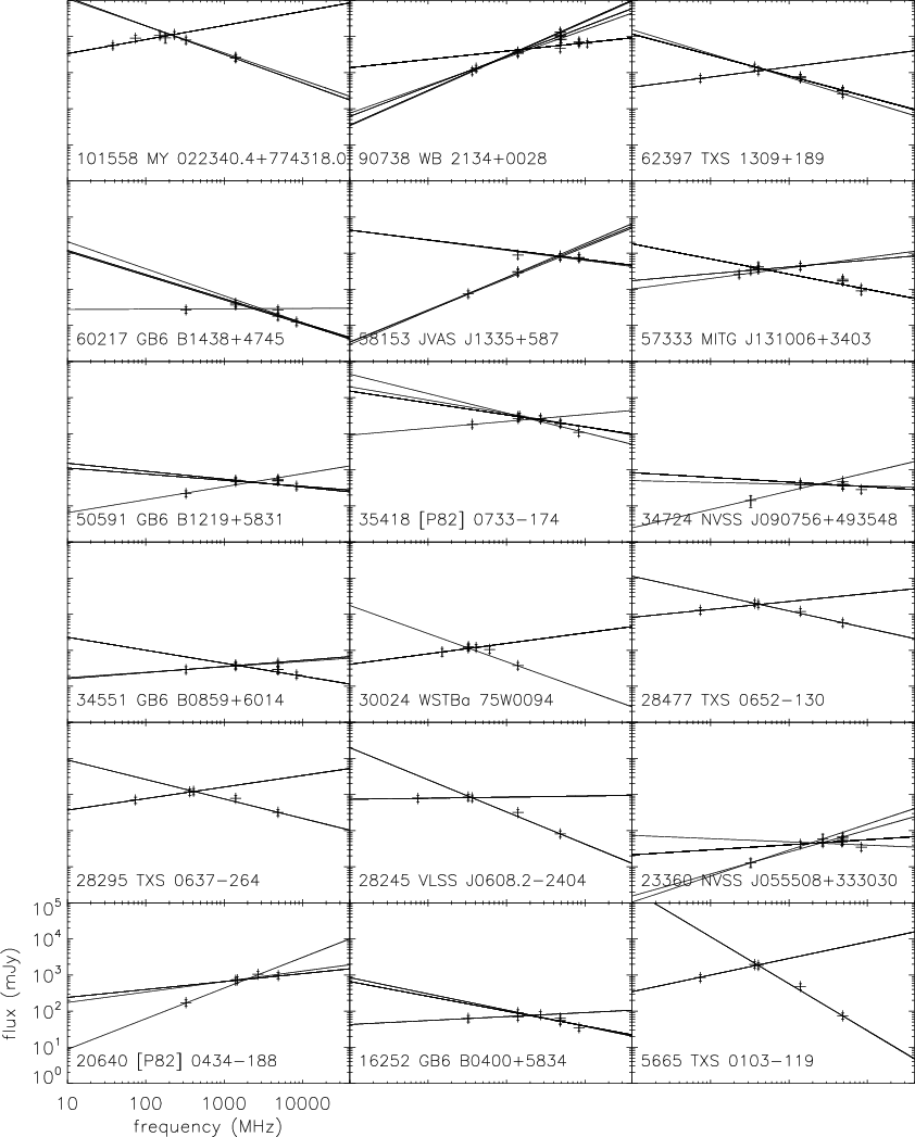 The cross-identification of radio sources observed in the centimeter to meter wavelength domain with different instruments is a rather difficult task because of huge differences in sensitivity, spatial resolution, and the non-simultaneous observations of variable sources. Especially the very different spatial resolutions of single dish telescopes and interferometers are difficult to handle. On the other hand, most sources show a power-law spectral energy distribution in these wavelengths due to synchrotron or thermal emission. Synchrotron emission produces a power law spectrum with a possible cut-off or reversal of the spectral index at low frequencies due to self-absorption or comptonisation. The spectrum of thermal electrons is flat in the optically thin domain.