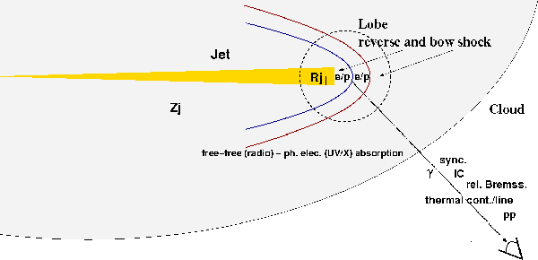 Figure 1: Sketch of the termination region of the jet of a massive YSO. Two shocks of different strengths and velocities will form depending on the jet-medium properties. Electrons and protons can be accelerated in the shocks, and generate nonthermal emission via interaction with the ambient matter, magnetic, and radiation fields. The shocked material will also produce thermal radiation. |