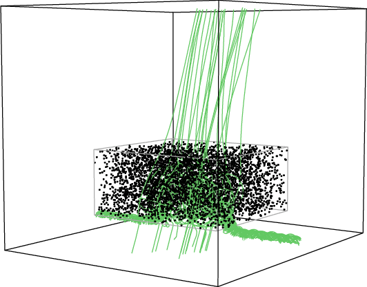 The structure and location of the particle impact with the photosphere is therefore a direct consequence of the extent and mapping for field lines penetrating the diffusion region and connecting to the photosphere. But, why does it include these small structural variations seen in the last of the images? Looking at the same type of impact map further up in the atmosphere, the mapping contains a much simpler mapping structure. The reason for the complicated patterns is located in the lower parts of the atmosphere. Here the magnetic fields lines are found to bend in different directions due to a weak convection like motion taking place. This indicates that the pressure gradient locally dominates the momentum equation, implying that the plasma density may be high enough to thermalize the accelerated particles at this height in the atmosphere.