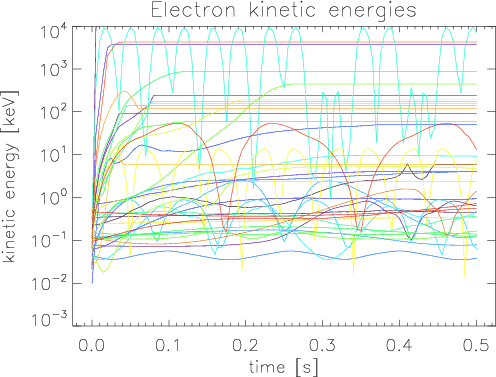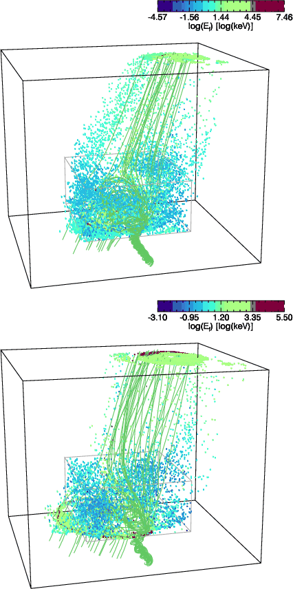 Figure 6: The pattern and energy distribution of the particles after 0.5 s time integration. The colour indicates the particle kinetic energy on impact with the photosphere. The three images represent different times in the numerical MHD experiment. |