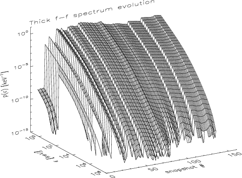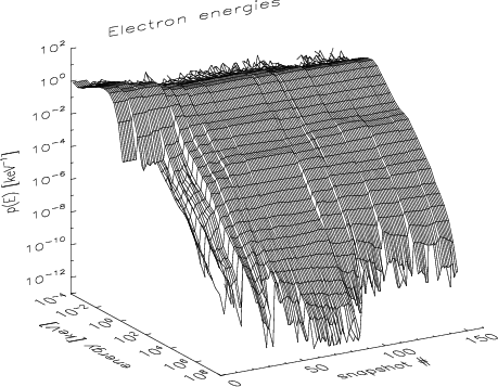 From a physical point of view the distribution functions give direct insight to the behavior of the particles. But, it is not a quantity that can be easily observed. Instead, we observe spectra from the radiation particles emit as they are de-accelerated on impact with the photosphere. This process occurs almost instantaneously which allows us to calculate the spectra directly from the particle distribution function. Brown (1971) and Holman (2003) provide detailed information about how to do this. Because of the very high energy tail of the distribution function, the relativistic formulae for the derivation must be used. This limits the energy of the most energetic photons in the spectrum, as it would otherwise only show one power law extending to very high energies.