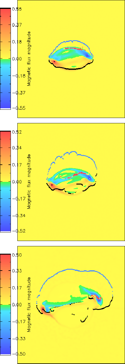 frames show three snapshots representing different times in the numerical MHD experiment. The