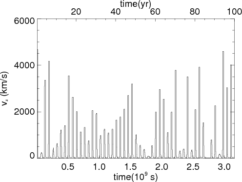 We expect some details of our model to depend on the assumption of the exponential distribution for the ejection velocity of each blob (determined with a given random seed). From a quantitative point of view, the single blob velocity can change with a different random seed and also the energetics and dynamics of particular structures are expected to vary if different velocity distributions are chosen. Nevertheless, we expect to obtain the main features discussed here, namely the formation of shock fronts, the collision among knots due to blobs ejected at different epochs with different speed, the interaction among knots, and reverse shocks.