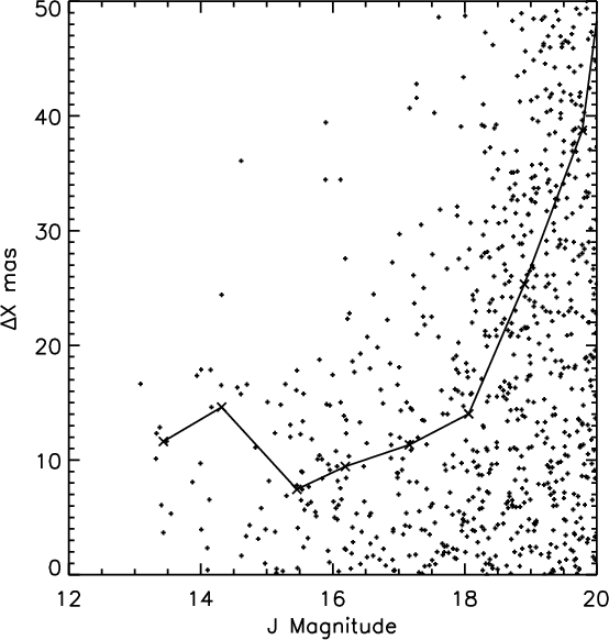 Figure 1: Object position difference between two observations of the same cluster made on 2005/06/20 and 2005/09/04 as a function of J magnitude. Plus signs are individual objects, crosses are median values. |