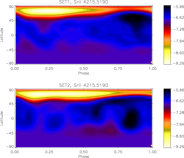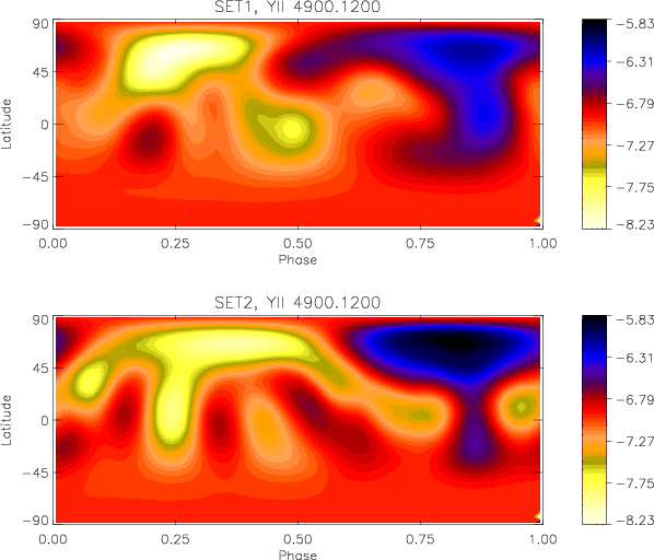The average S/N ratio of the HD 11753 observations for set1 and set2, measured at 4400 Å are 132 and 143, respectively. This means that in Doppler imaging a smaller deviation than this should not be achieved between the model and the observations. In the Tikhonov regularisation used by INVERS7PD the regularisation has to be chosen in a way that the noise in the observations is not mapped. For HD 11753 the deviation between the model and observations for the set1 is between 0.750% (Y II 4900.120 Å) and 0.893% (Sr II 4215.5190 Å), and for the set2 between 0.628% (Y II 4900.1200 Å) and 0.803% (Sr II 4215.5190 Å). These values are comparable to the average noise level in the observations. One has to also keep in mind that the noise level in the blue part is higher than in the red part of the spectrum. Furthermore, the comparison of the model and observations shows that the line profiles are well fitted without the model following the noise. An example of the line profile fits is shown in Fig. B.1 for the Y II 4900.1200 Å line of set2.