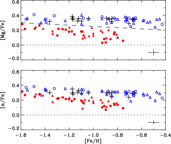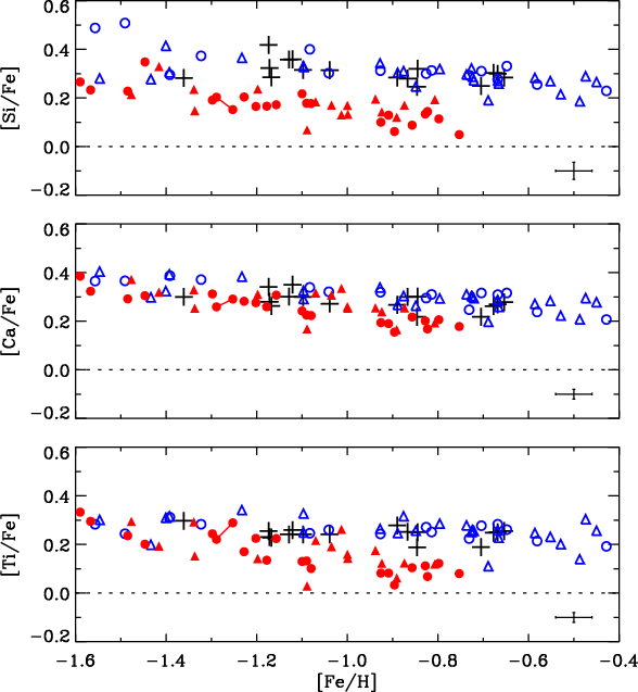Figure 5: [Si/Fe], [Ca/Fe], and [Ti/Fe] as a function of [Fe/H]. The same symbols as in Fig. 1 are used. |