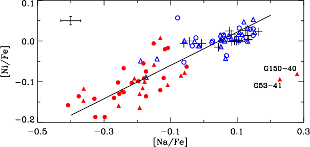 Figure 2: [Ni/Fe] versus [Na/Fe] with the same symbols as in Fig. 1. The linear fit does not include the two Na-rich stars. |