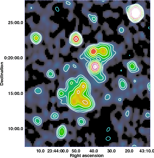 Figure 3: Polarized emission from ZwCl 2341.1+0000 at 1.4 GHz. Contours show the total-intensity emission at low resolution (see Fig. 2). Lines refer to the E vectors. Their orientations represent the projected E-field uncorrected for the Galactic rotation. Their length is proportional to the fractional polarization: 1'' corresponds to 0.2%. |