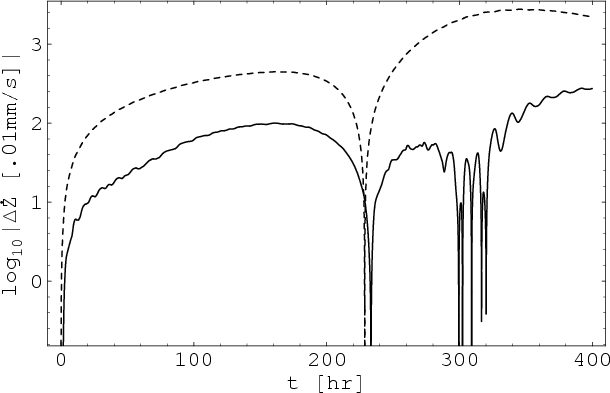 Doppler signals related to the outgassing pressure (solid) and the nucleus' c20 gravity field (dashed) are shown for an initial orbit semi-major axis of