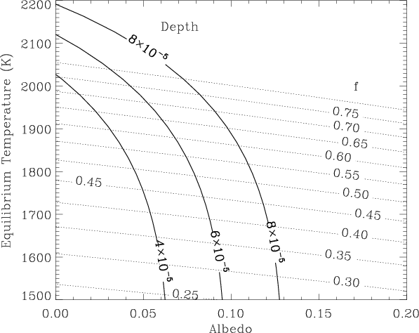 Figure 6: The equilibrium temperature of CoRoT-2b as a function of the albedo matching the observed secondary eclipse depth. The zero-albedo equilibrium temperature is about 2120 K. In dotted lines, we plot the re-distribution factors f. Realistic re-distribution factors require the contribution of some reflected light (non zero albedo) or the presence of an additional source of energy in the planet (assumed zero in this plot). |