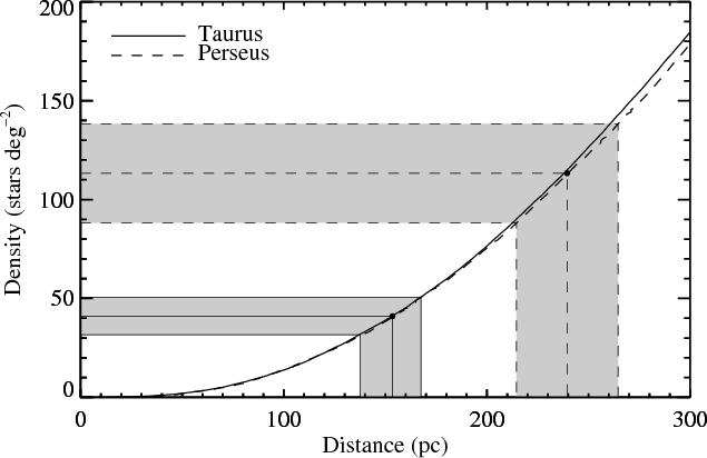 - We calculated the distances of the Taurus and Perseus clouds by comparing the density of foreground stars with the prediction of the Robin et al. (2003) Galactic model. The values obtained are in excellent agreement with recent independent VLBI parallax measurements.