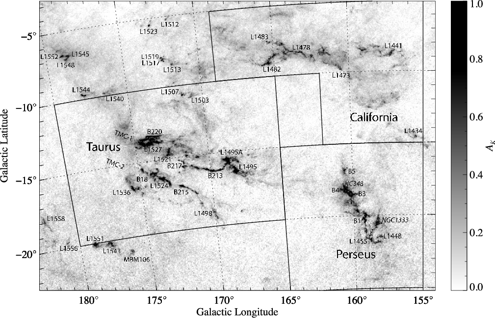 Taurus, Perseus, and California molecular cloud complexes. We