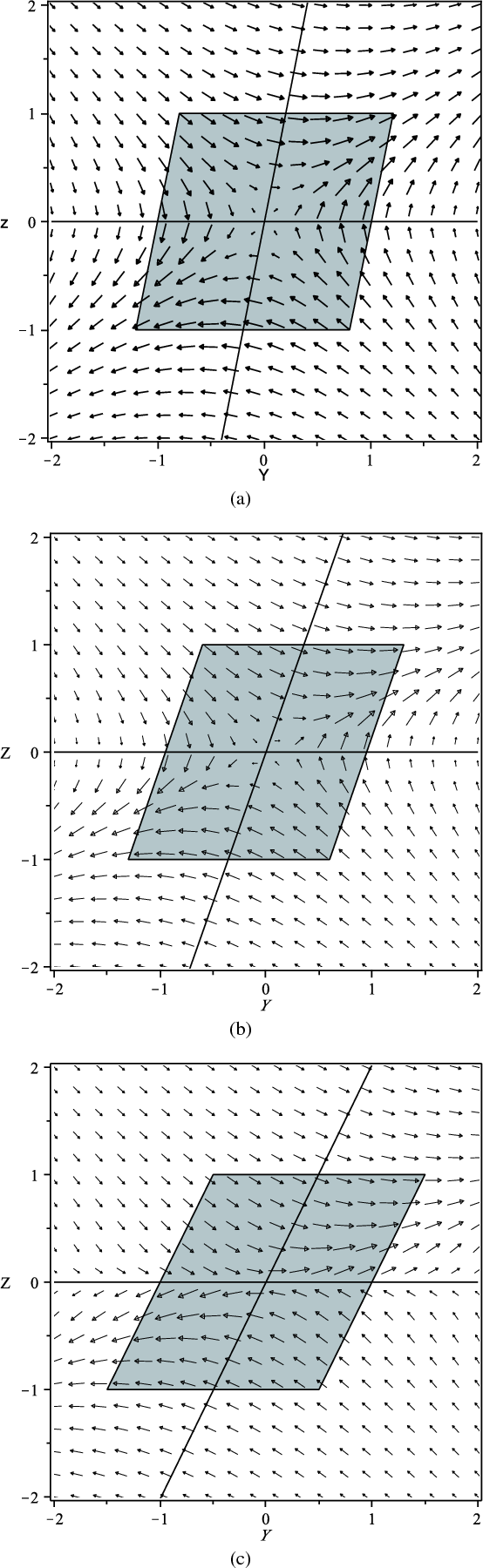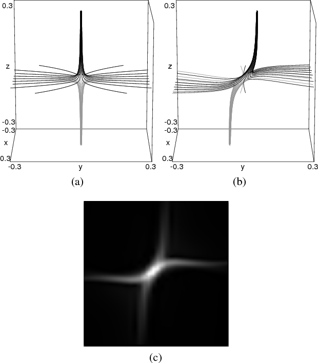 Also, in both cases the flow in the yz-plane exhibits a stagnation-point structure. There is agreement between the model and the simulations, in that for large p the stagnation structure is relatively symmetric, while for smaller p the flow across the fan becomes confined to a narrower region, and weaker compared with the flow across the spine.