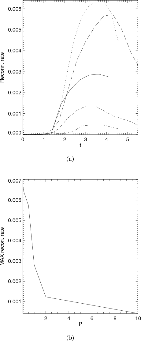 respectively, as p is increased (see Fig. 4). Turning to the simulations, as shown in Fig. 9 the reconnection rate indeed becomes very large as
