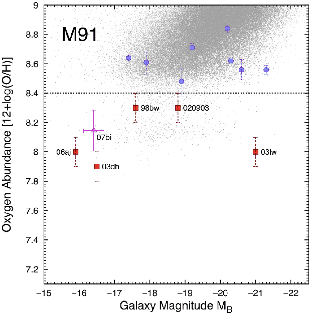 Modjaz et al. (2008a) measured the metallicities at the sites of all GRB associated SNe Ic-BL (GRB/SNe Ic-BL) and compared them to the metallicities measured at the sites of those SNe Ic-BL not found in association with a GRB (non-GRB/SNe Ic-BL). Regardless of the abundance scale employed, Modjaz et al. found that the environment of every non-GRB/SN Ic-BL was more metal-rich than the environment of any of the GRB/SNe Ic-BL. Upon studying the host galaxies of 42 GRBs discovered within the Hubble Higher-z Supernova Search, Fruchter et al. (2006) found that GRBs (a) typically favour low-luminosity, blue; irregular galaxies and (b) tend to concentrate on the very brightest regions of these host galaxies. This evidence adds weight to the theory that the progenitors of GRBs are massive stars that inhabit low-metallicity environments (e.g. the ``Collapsar'' model: Woosley 1993; Woosley & Bloom 2006).