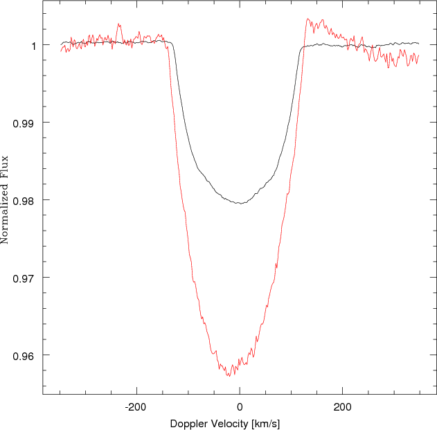 Figure 3: The mean line profiles of the system as obtained from FDBinary normalized to the continuum. Black line: primary star. Red line: secondary star. |