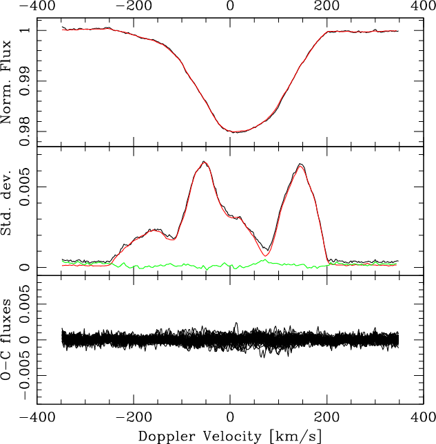 Figure 5: Upper panel: average LSD profile (black) and synthetic average mean profile (red). Middle panel: standard deviation of both the LSD line profiles (black) and the synthetic ones (red). The difference between the two is shown by the green line. Lower panel: differences between each LSD profile and the corresponding synthetic one, built using the constant line profiles of the two components computed by FDBinary shifted according to the derived orbital radial velocities. |