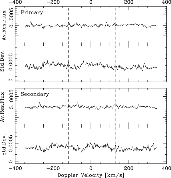 Another check was performed. We subtracted from each LSD profile the corresponding synthetic one and then shifted these residual LSD profiles to correct for the radial velocity of the primary component. Figure 6 shows in the upper part the average of the residuals (first panel) and its standard deviation (second panel). The broken lines indicate the position of the borders of the line of the primary component. No significant variations are visible within these borders. The same test was performed by correcting for the secondary component motion. In this case the profile also does not show any detectable variation (see the lower panel of Fig. 6).