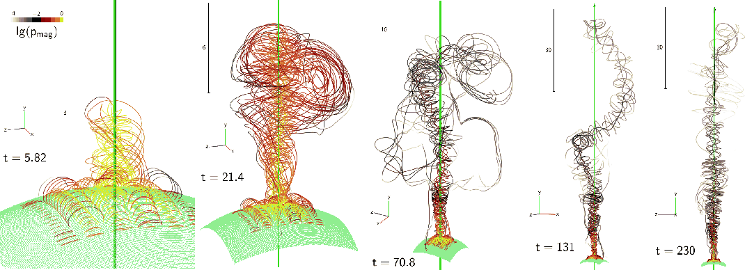 Although the simulations presented here demonstrate possible forms of rotation-induced acceleration, they are probably not realistic models of true accretion disks. One may wonder what happens in a more realistic scenario, where more complicated or chaotically arranged magnetic field loops emerge from the disk. Obviously, magnetic reconnection would likely play a major role in such a scenario. Nonetheless, the surviving magnetic field is stretched out in the azimuthal direction by the rotation, and the free energy in the toroidal field is transformed into an outflow. Temporary fluctuations are likely to occur if the supply of magnetic field loops is not continuous. The coherent length of the jet will then be determined by the speed with which reconnection processes destroy the initial field by which the flow is produced. The jet may flare up anew when new loops emerge. This effect could be responsible for the temporary fluctuations in gamma ray bursts.