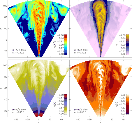 The final state of the jet, at large distances from the source, depends on the impact of instabilities in the region beyond the computational volume of the simulations presented here. It is reasonable to believe that the jet continues as a ballistic flow when the instabilities cease to be effective (due to the expansion of the jet and a possible decay of the toroidal field). A ``disruption'' of the jet would require a strong interaction with the medium into which it propagates; the atmosphere at large distances is probably too thin for that.