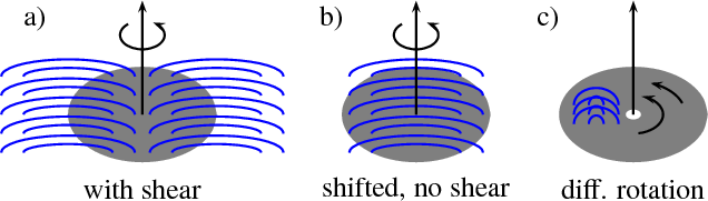 Figure 1: Considered magnetic field geometries. In case (a), the field lines are anchored at one end in a rigidly rotating disk. In case (b), the field lines' footpoints are either both anchored in the disk, or they are both anchored outside of it. In case (c), the field emerges from a limited area inside the disk, which is differentially rotating. |