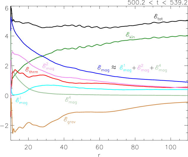 Figure 11: Energy flow rates in the jet presented in Sect. 4.3. Magnetic enthalpy (integral over Poynting flux, blue line) is converted into kinetic energy (green line) and potential energy (brown line). |