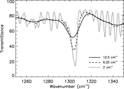 To characterize the differences in the 1306 cm-1 methane band going from a relatively high- (0.2 cm-1) to low-resolution spectrum (12.5 cm-1), we measured the trasmittance of a pure methane sample contained in a 1.6 mm thick sealed cell at standard atmospheric pressure and temperature. The spectra were recorded using a Perkin Elmer Spectrum 2000 Fourier Spectrometer and are shown in Fig. 1. As seen, the spectral contrast is only reduced by a factor 1.5 going from 2 to 6.25 cm-1, and of a factor 2.5 when going from 2 to 12.5 cm-1. In addition, the spectral contrast of the methane feature at a resolution of 2 cm-1 is more than 0.9 of that collected at a resolution of 0.2 cm-1, which is not reported in Fig. 1 for the sake of clarity. From the spectra shown in Fig. 1, it is clear that it would be highly desirable to use only the TES data collected at 6.25 cm-1 resolution, but they are a small fraction of the data collected at 12.5 cm-1 resolution.In this respect we investigated the lowest amount of methane detectable by TES by applying the calculation of Maguire (1977) for the case of IRIS. The IRIS data set consists of 1747 infrared spectra (from 200 to 2000 cm-1) with a spectral resolution of 2.4 cm-1 scattered throughout the entire planet. Given the average NESR of