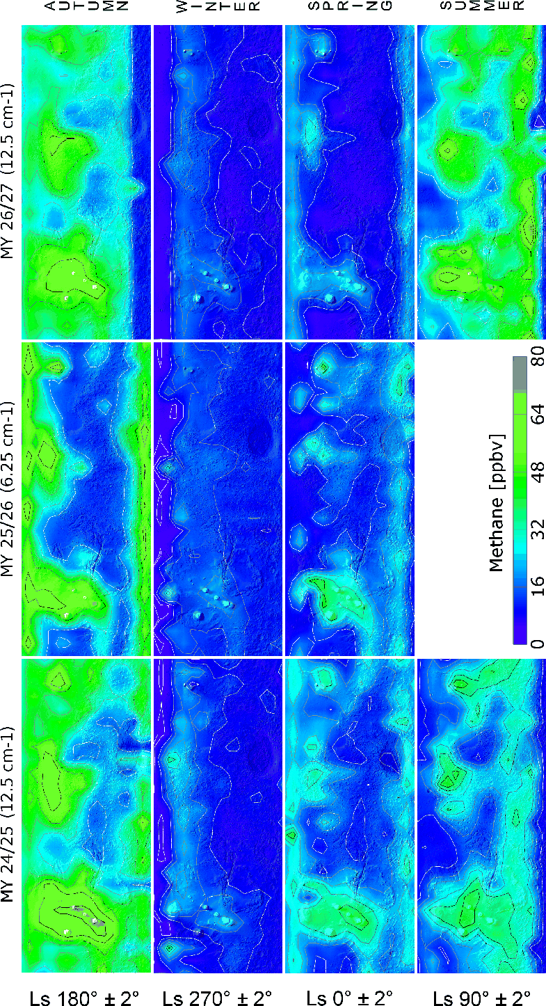 - While our results cannot reveal the possible sources or sinks of the methane, it is evident that the highest concentrations are associated with the warmest seasons, and locations where favourable geological conditions, such as residual geothermal activity (Tharsis and Elysium) and strong hydration (Arabia Terrae), are expected on Mars. The higher energy available in these seasons could trigger both volatile release, which is related to geological processes, or outbreaks of biological activity.