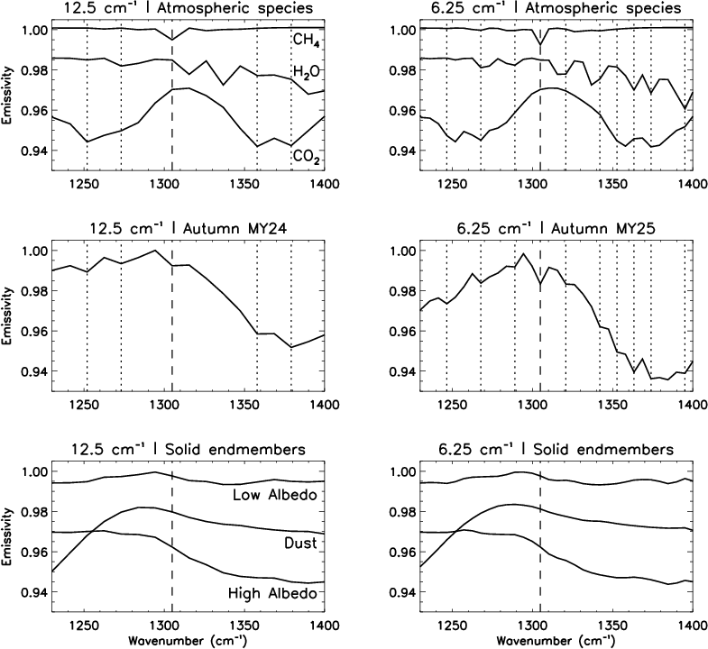 Figure 3: Comparison of a set of synthetic spectra at TES resolutions with the observed average spectra corresponding to two methane clusters ( middle panels). In the top panels CO2 (offset by -0.025), H2O (300 ppmv, offset by -0.015), and CH4 (60 ppbv), computed in martian conditions, are reported. In the bottom panels the solid endmembers relative to low-albedo and high-albedo surfaces (offset by -0.025) are shown, along with the opacity-derived emissivity of aerosol dust (arbitrarily scaled). |
