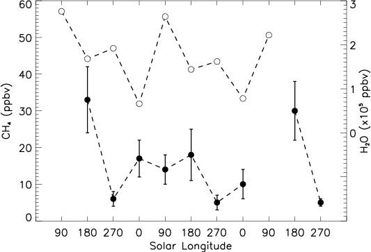An annual cycle, such as observed in Fig. 2, is consistent with a methane lifetime of 0.6 years (Mumma et al. 2009), which is much shorter than 350 years as previously suggested based on photochemical processes (Krasnopolsky et al. 2004; Wong et al. 2003). Strong oxidizers can be more effective than photochemistry in rapidly removing methane from the atmosphere (Benner et al. 2000; McDonald et al. 1998), and aeolian processes can favour the atmospheric introduction of oxidants (Delory et al. 2006; Atreya et al. 2007), such as H2O2 (Atreya et al. 2007) or the recently detected XCl4 (perchlorate) by the Phoenix lander (Hecht et al. 2009).