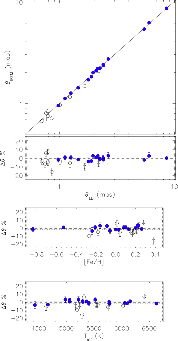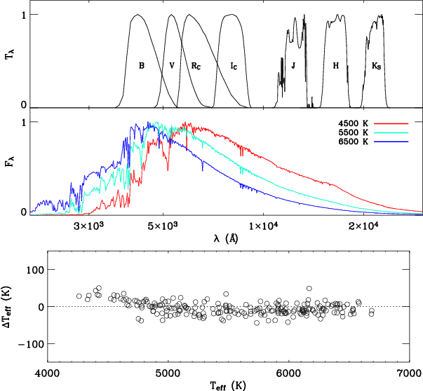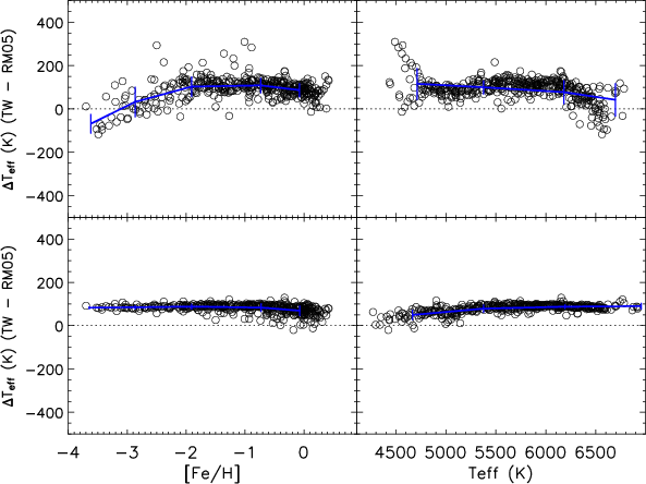 In such a scenario, an almost model independent and elegant technique for determining effective temperatures was introduced in the late 70's by D. E. Blackwell and collaborators (Blackwell & Shallis 1977; Blackwell et al. 1980,1979) under the name of InfraRed Flux Method (hereafter IRFM). Since then, a number of authors have applied the IRFM to determine effective temperatures in stars with different spectral types and metallicities (e.g. Bell & Gustafsson 1989; González Hernández & Bonifacio 2009; Ramírez & Meléndez 2005a; Alonso et al. 1996a; Casagrande et al. 2006). The main ingredient of the IRFM is infrared photometry, with the homogeneous and all-sky coverage provided by 2MASS being the de facto choice nowadays. As such, the IRFM can now be readily applied to many stars, making it ideal to determine colour-temperature-metallicity relations spanning a wide range of parameters. The effective temperatures determined via IRFM are often regarded as a standard benchmark for other techniques. Whilst they have high internal accuracy and are essentially free from non-LTE and granulation effects (Asplund & García Pérez 2001; Casagrande 2009; Ramirez et al. in prep.), the reddening and absolute flux calibration adopted in such a technique can easily introduce a systematic error as large as 100 K (Casagrande et al. 2006).