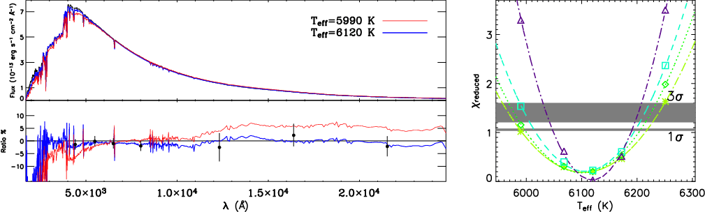 - We point out that Eq. (1) holds exactly for a heterochromatic measurement, while for computing a monochromatic flux from the observed photometry, an additional correction (the so called q-factor) must be introduced to account for the fact that the zero point of the photometric system is defined by a standard star, which usually has a different spectral energy distribution across the filter window with respect to the problem star (e.g. Casagrande et al. 2006; Alonso et al. 1996a).