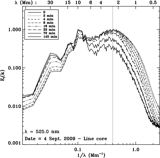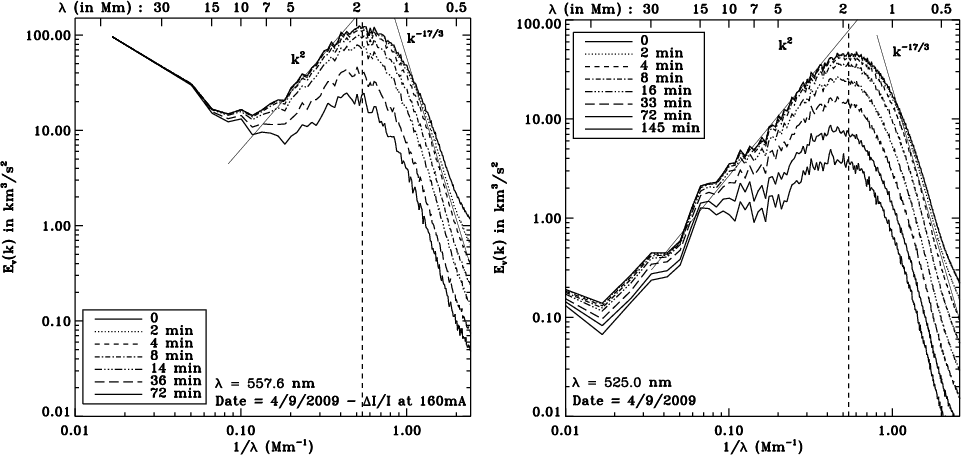 The paper is organised as follows: after a brief presentation of the data and the techniques to process them (Sect. 2), we detail the spectral properties of the measured velocity fields (Sect. 3) and the intensity field (Sect. 4). A discussion and physical interpretation of the results follows (Sect. 5). The main results and conclusions are summarised at the end of the paper (Sect. 6).