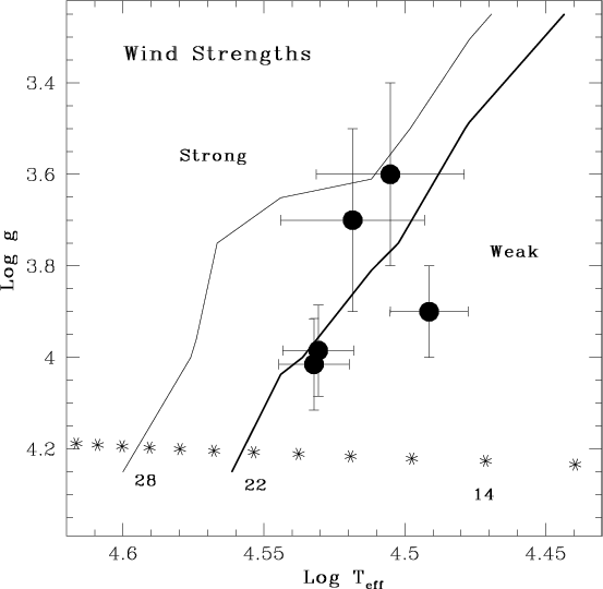 Fe IV (cf. Vink et al. 2000). Thus, in the weak-wind domain at