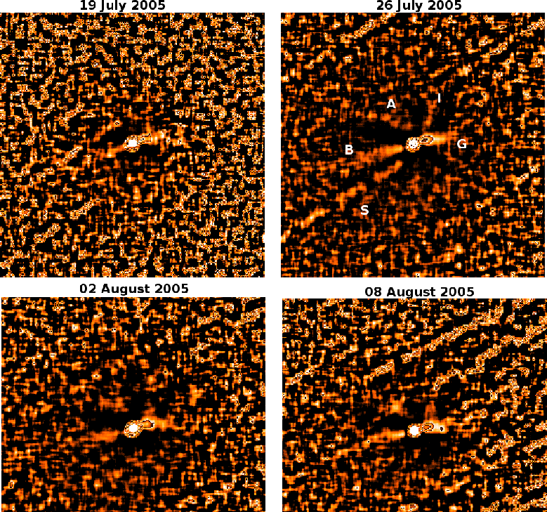 , longitudes are only roughly estimated. They are responsible for the jets (F, G, H) in the pre-perihelion exposures;